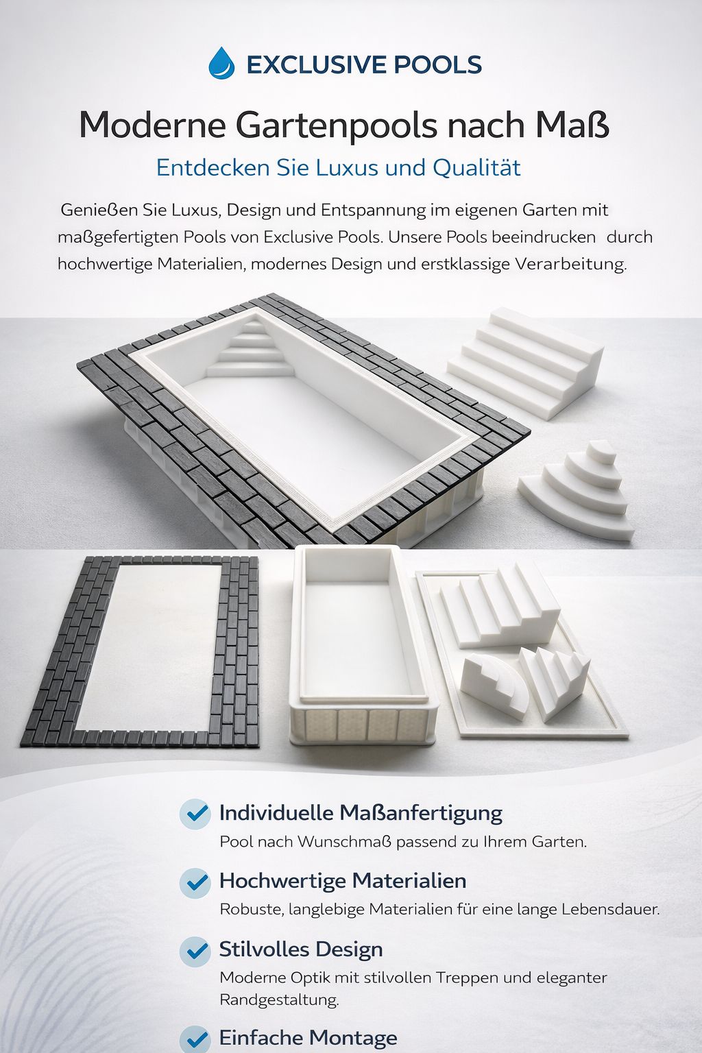 Erleben Sie Ihren Pool bereits vor dem Bau als maßstabsgetreues 3D-gedrucktes Modell. Beckenform, Treppen und Details werden realistisch dargestellt und machen Planung und Design greifbar. Der Modellpreis wird bei Umsetzung vollständig mit der Poolbau-Rechnung verrechnet – Ihr 3D-Modell wird damit zum exklusiven Geschenk.